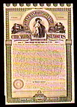 These certificates are for people who like to collect "large banknotes," for that's often their appearance. There are thousands of different companies which have issued such items in the past, and no book or collection of books could ever come close to covering them all. They can be (and often are) collected by industry, particularly railroads, automobiles, mines, and ships. They can also be collected by vignette (picture) subject and also for autographs by notable financial personalities. Oftentimes the same vignette can be found on world banknotes. Other collectors may appreciate high denomination bonds. There are bonds we've carried with original issued values as high as $1,000,000! Now cancelled, these make great conversation pieces - a piece of paper that was once worth $1,000,000 dollars. These items come in all sizes, shapes, and colors. The engravings on many certificates, particularly the older items printed by the American Bank Note Co. (ABNC) and others, are absolutely phenomenal and will make a beautiful wall display when framed or displayed, perhaps with examples of one's banknote collection. Why not start or add to your collection of these interesting, historical items? We will be adding in our stock of nice old certificates to our new retail site (click on the Mexican note below).